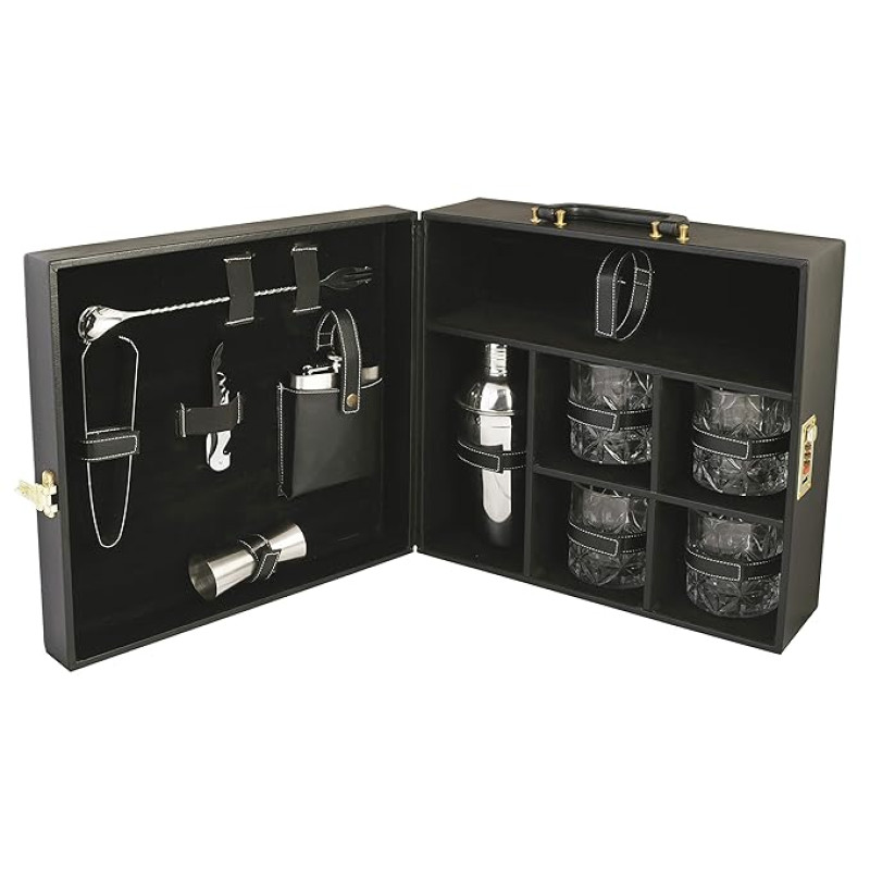 Anything & Everything Portable Bar Set | Portable Leatherette Bar Set | Wine Case | Whisky Case | Portable Bar Accessories Set (Holds 01 Bottle & 04 Whisky Glasses) (Black & Black)