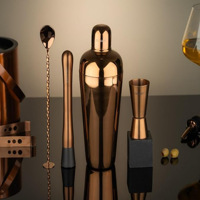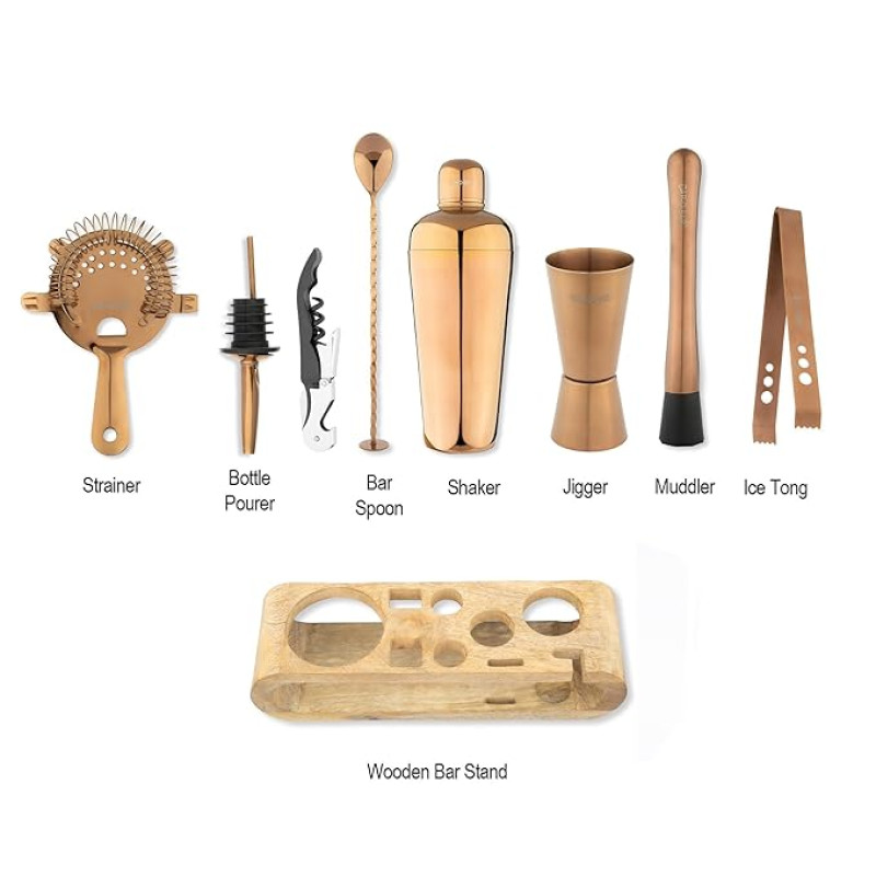Car-O-Bar Copper Gold Bar Set with Stand | 10 Piece Bartender Kit :Cocktail Shaker, Bar Spoon, Jigger, Muddler, Strainer, Wine & Beer Bottle Opener, 2 Pour Spouts, Tong, Wooden Stand (Copper Gold)