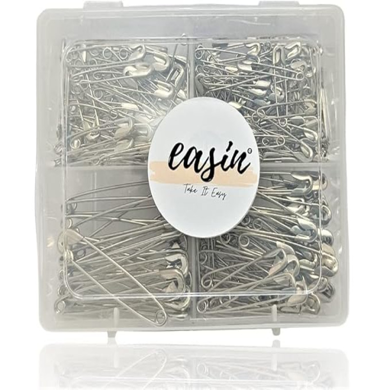 easin Safety Pins Mixed Assorted for Women & Girls Used in Saree Earrings Necklace Organizer Brooch Pins, Different Sizes (1,2,3,4) Heavy Standard Stainless Steel with Reusable Partition Box
