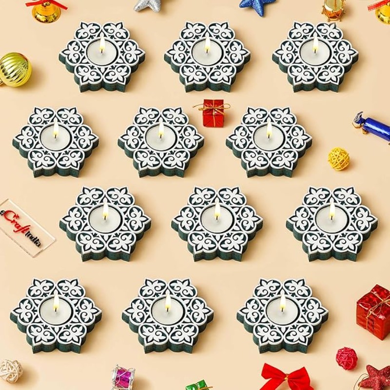 eCraftIndia Wooden Floral Printing Block Decorative Tea Light Candle Holders (Set of 12, Green)| Christmas Diwali Decoration Items for Home Office| Christmas Gifts for Women Men Family Friend