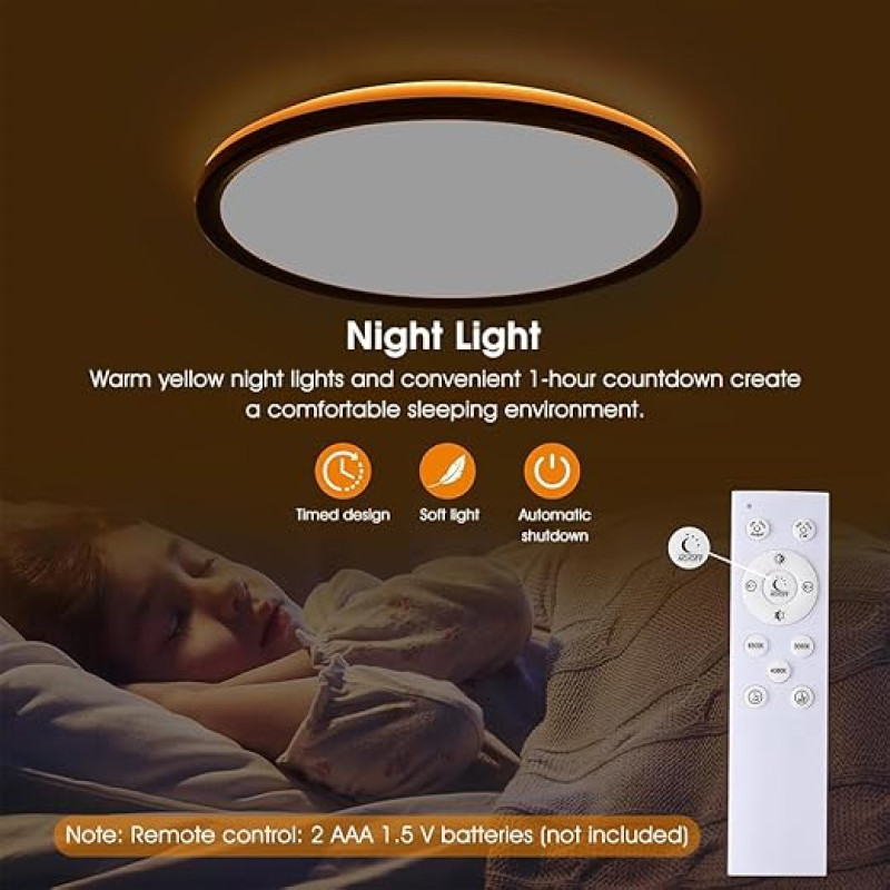 ELEPHANTBOAT plastic 12" Dimmable LED Ceiling Light with Remote Control, 24 W 3-Color Ceiling Light with Dim Night Light 1800k Warm, Round Flush LED Ceiling Lights (Black)