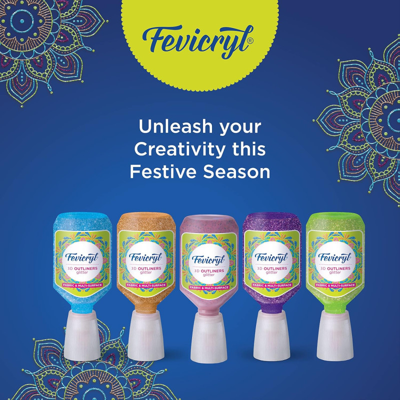 Fevicryl 3D Outliners Glitter Kit 20ml x 5 | Fabric and Multi-Surface 3D Outliners Assorted Pack, Multi Colour | DIY Art & Craft | Ideal for Artists, Gifting