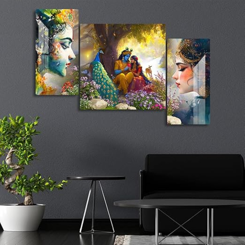 FIVE KRAFT Radha Krishna Wall Painting Set of 3 ? Wall Art with Peacock & Nature for Home Decor Living Room, Bedroom & Pooja Room | 32x16 Inches