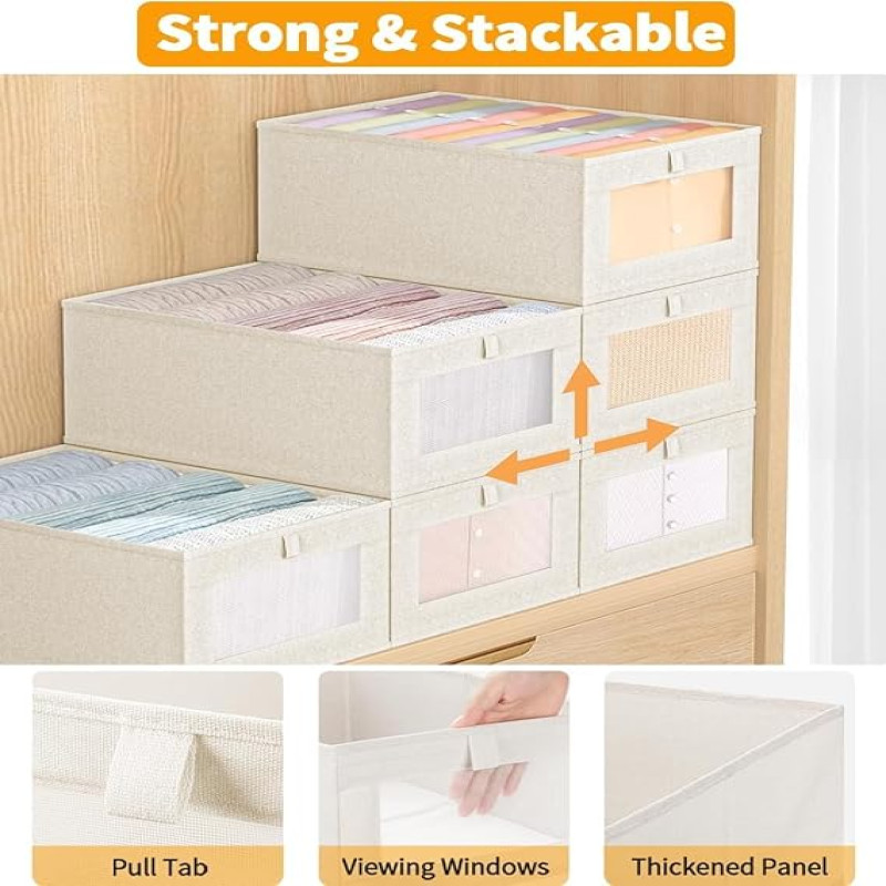FLYNGO 4 Pcs Linen Wardrobe Organizer for Clothes Organiser Storage Box with Clear Window, Foldable Closet Organiser Basket for Clothing, Jeans, Pants, T Shirts, Toys | 40 x 27 x 17 Centimeters