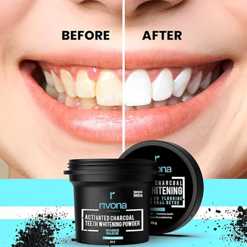 RIVONA NATURALS Activated Charcoal Teeth Whitening Powder - For Enamel Safe Teeth Whitening, Stain Remover, Freshens Breath - With Activated Charcoal, Turmeric & Clove Powder - 35g (Fluoride Free)
