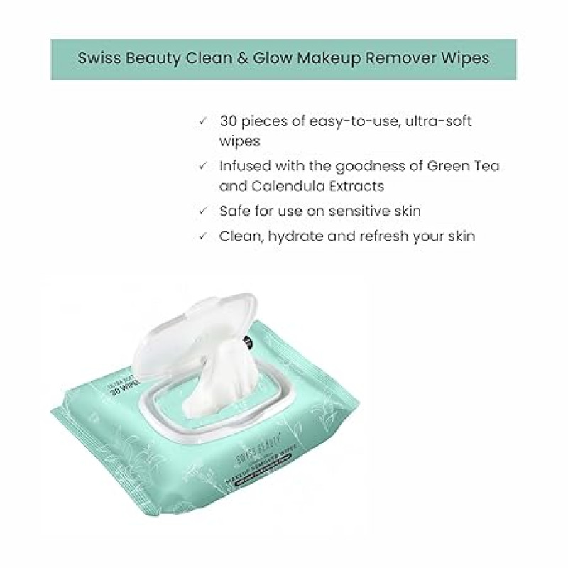 Swiss Beauty Clean & Glow Makeup Remover Wipes | With Green Tea And Calendula Extracts| Cleansing And Hydrating Facial Wipes| 30 Wipes
