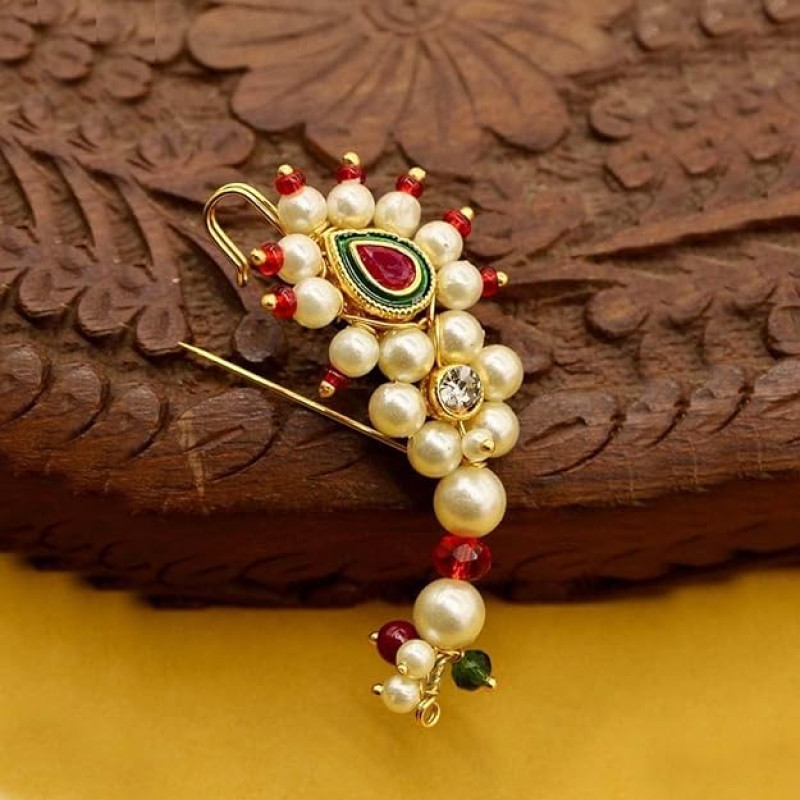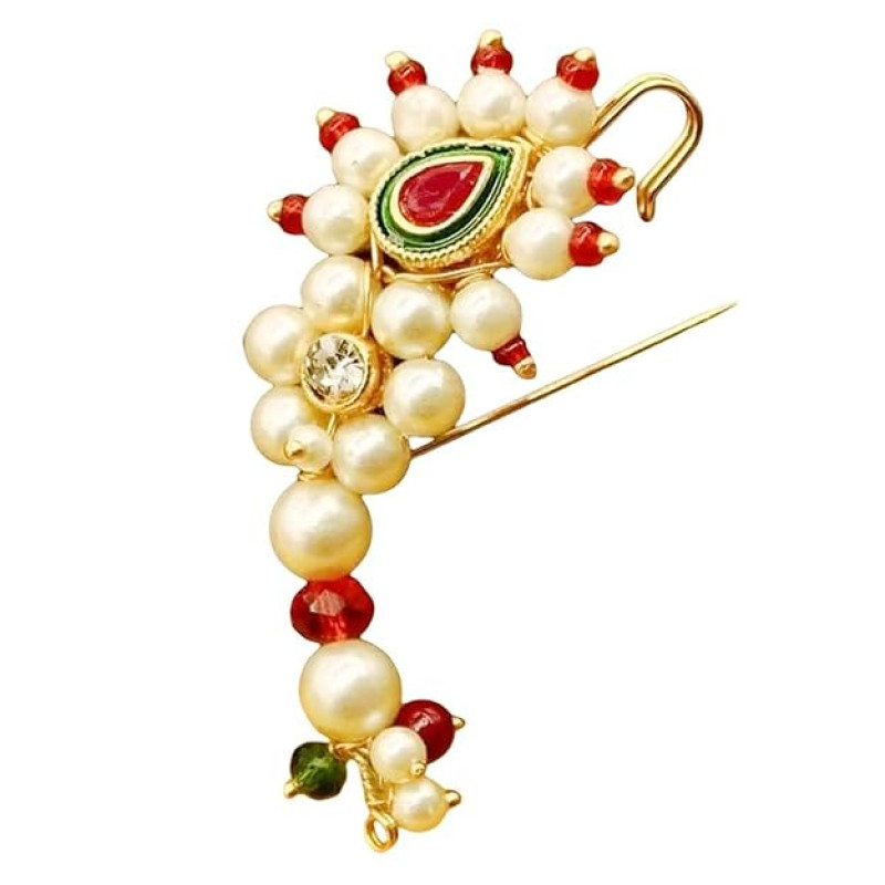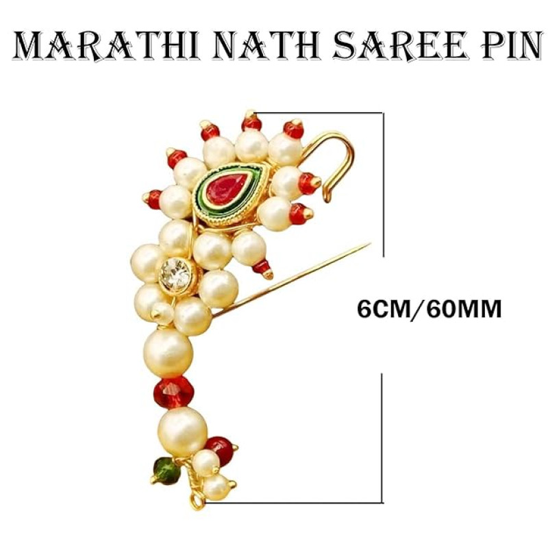 ? Stunning Banu Nath Design: Features a traditional Maharashtrian Banu Nath design Safety pin brooch, enhancing the elegance of your Nauvari and Paithani sarees.
