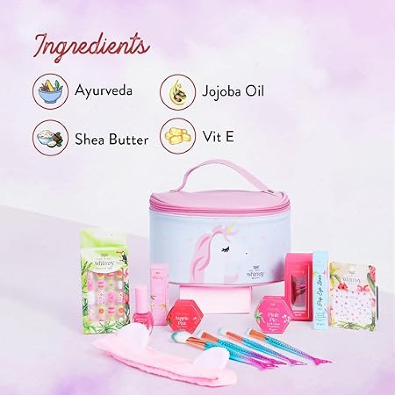 Whimsy Beauty 13-Piece Safe & Organic Unicorn Travel Beauty Kit for Girls, Preteens & Teens | Water-Washable Makeup Set with Lip Balm, Lip Cheek Tint, Lip Gloss, Eye Glitter, Nail Polish & Brushes