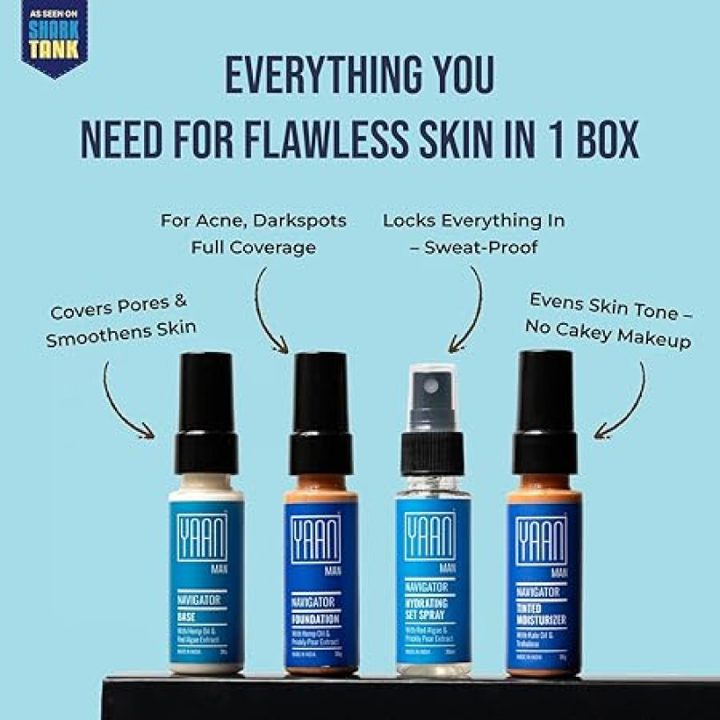 YAAN MAN Navigator Range | Make Up For Men | Contains: Base, Foundation, Set Spray, Tinted Moisturizer| Light Weight, Invisble On Skin | For All Skin Types (Medium), 4 count