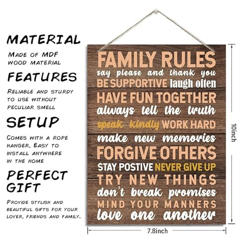 ZPPRJF Family Rules Sign, Inspirational Wooden Wall Plaque, Brown, Rustic Style, Small